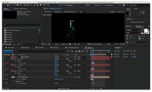 This was an only Adobe After Effects project, using simple shapes for the background fireworks and particles for the appearing type.